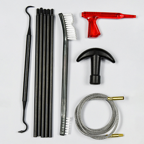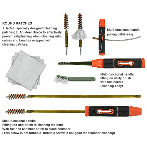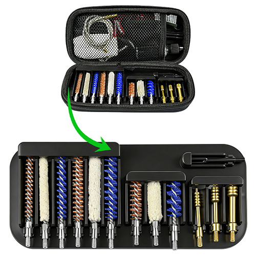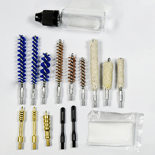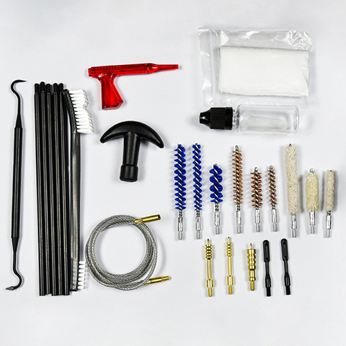 ရိုင်ဖယ်နှင့် လက်ပစ်သေနတ် သန့်ရှင်းရေးကိရိယာတွင် အရွယ်အစား ၃ မျိုး ( .22cal. .30cal. 9mm) ပါဝင်သည်။ OX အထည် ဇစ်ဖြင့်အုပ်ထားသော PVC အိတ်။ ကြေးစုတ်တံ၊ ချည်ကြမ်းတိုက်၊ နိုင်လွန်စုတ်တံ၊ ကြေးအိုး၊ ၅ချောင်း ၁ချောင်း။ သဲ နှင့် အနက်ရောင် ရွေးချယ်နိုင်သည် ။