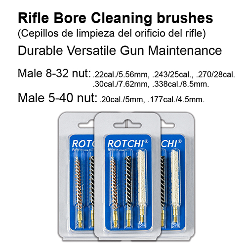 3-in-1 ရိုင်ဖယ် သန့်ရှင်းရေး စုတ်တံ၊ မီးလောင်ဖုနှင့် ကတ်အထုပ်။ ရရှိနိုင်သောအရွယ်အစားများ- .177, .22, .25, .27, .30,.338 cal.